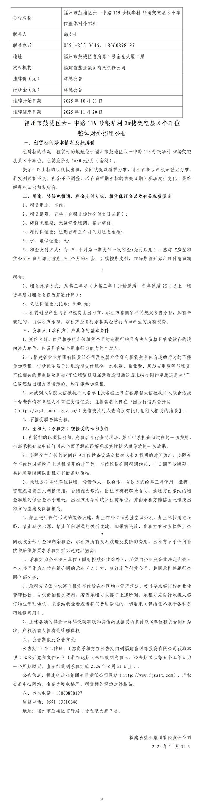 福州市鼓楼区六一中路119号银华村3#楼架空层8个车位整体对外招租公告
