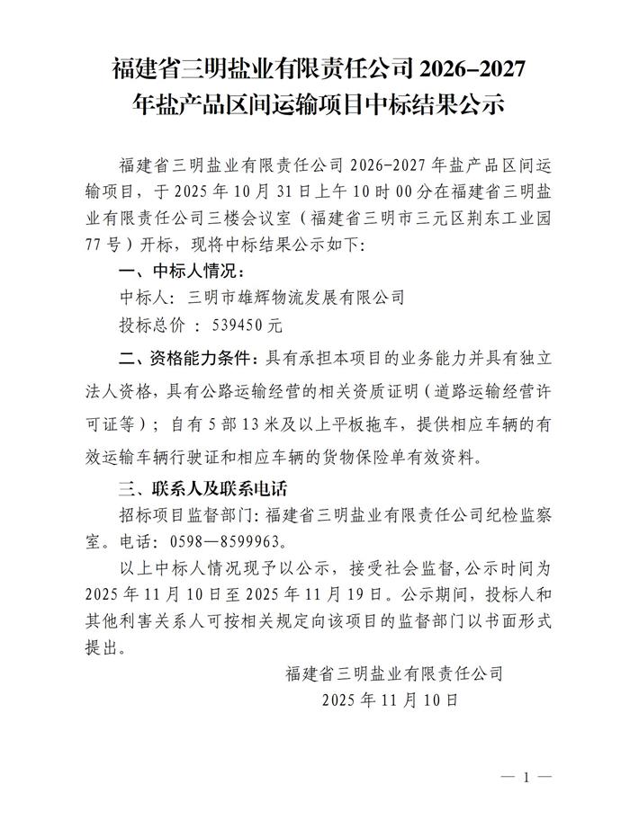 福建省三明盐业有限责任公司2026-2027年盐产品区间运输项目中标结果公示
