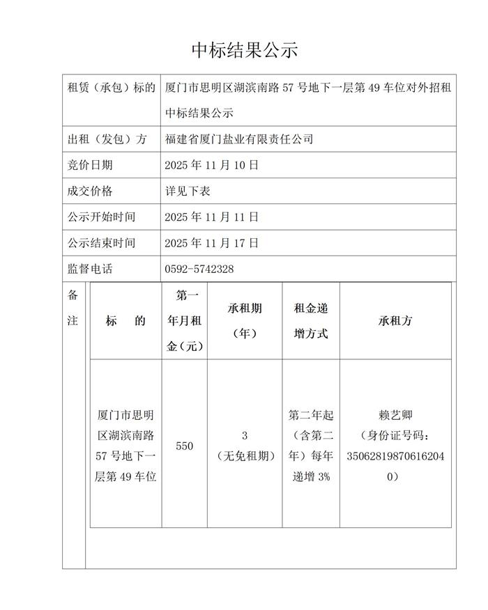 厦门市思明区湖滨南路57号地下一层第49车位对外招租中标结果公示