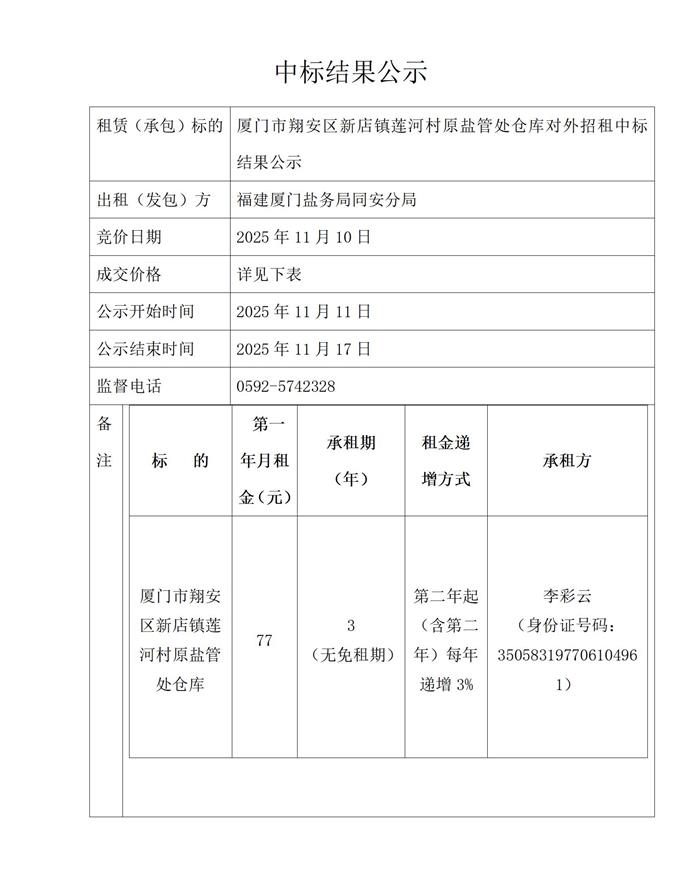 厦门市翔安区新店镇莲河村原盐管处仓库对外招租中标结果公示