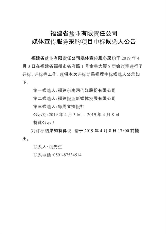 福建省盐业有限责任公司媒体宣传服务采购项目中标候选人公告