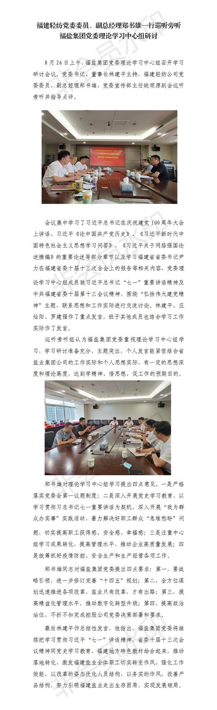 福福建轻纺党委委员、副总经理郑书雄一行巡听旁听福盐集团党委理论学习中心组研讨