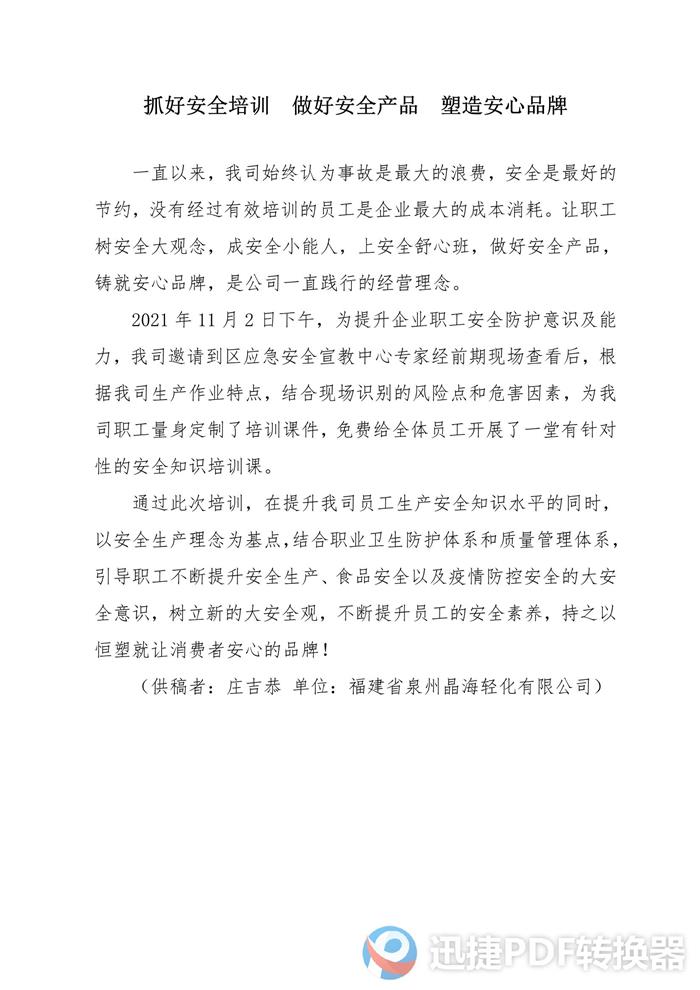 晶海公司抓好安全培训 做好安全产品 塑造安心品牌