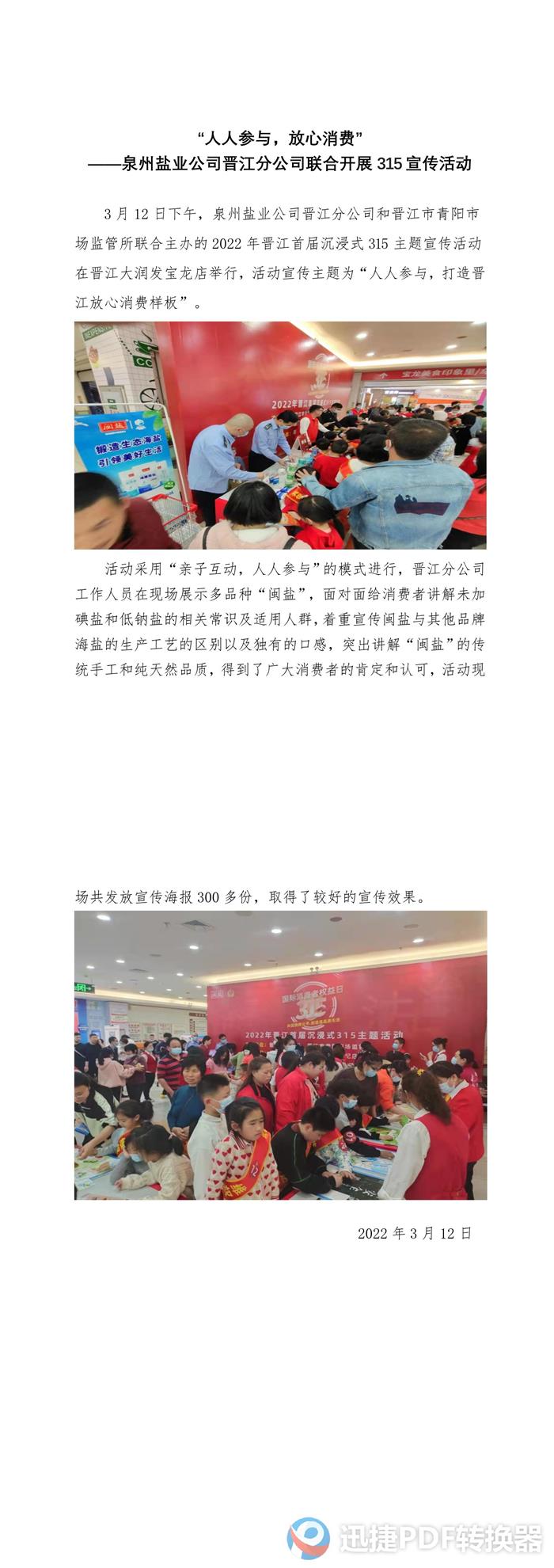 “人人参与,放心消费” ——泉州盐业公司晋江分公司联合开展315宣传活动