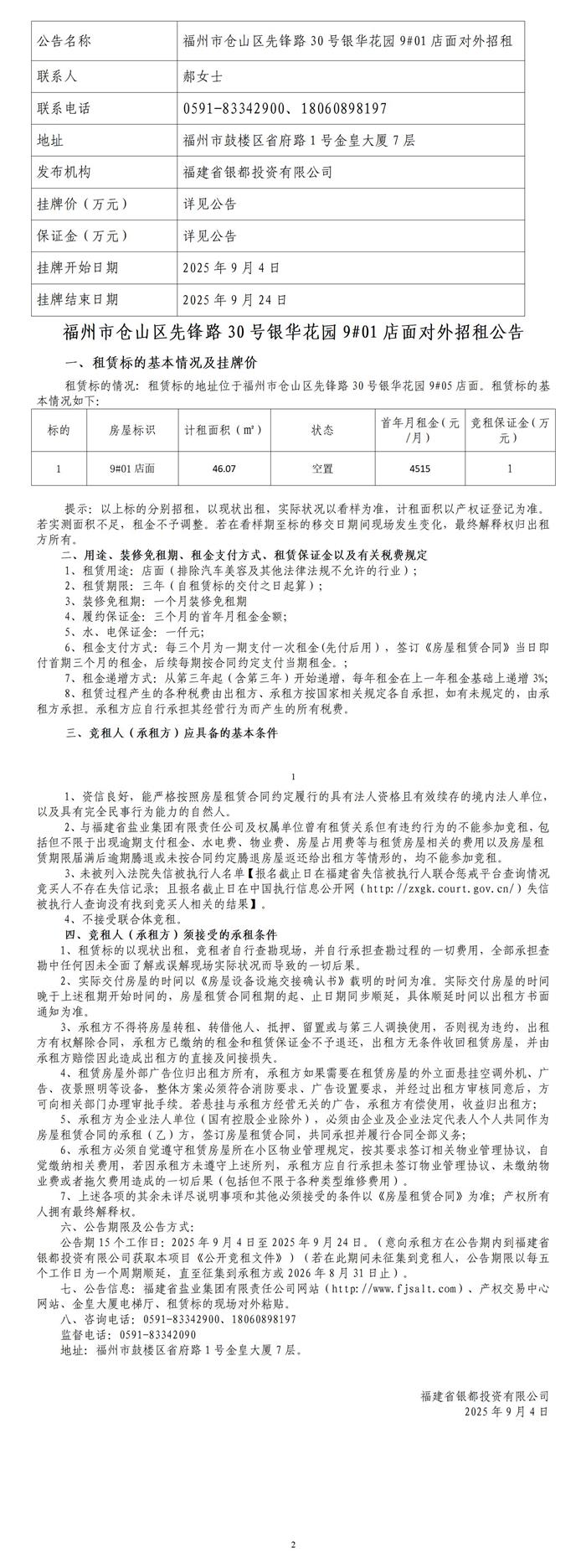 福州市仓山区先锋路30号银华花园9#01店面对外招租公告