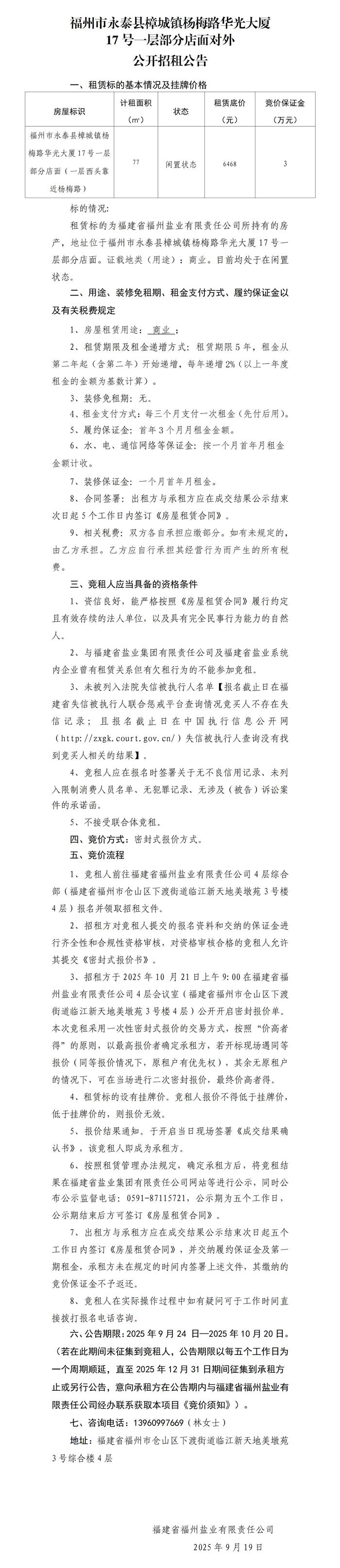 福州市永泰县樟城镇杨梅路华光大厦17号一层部分店面对外公开招租公告