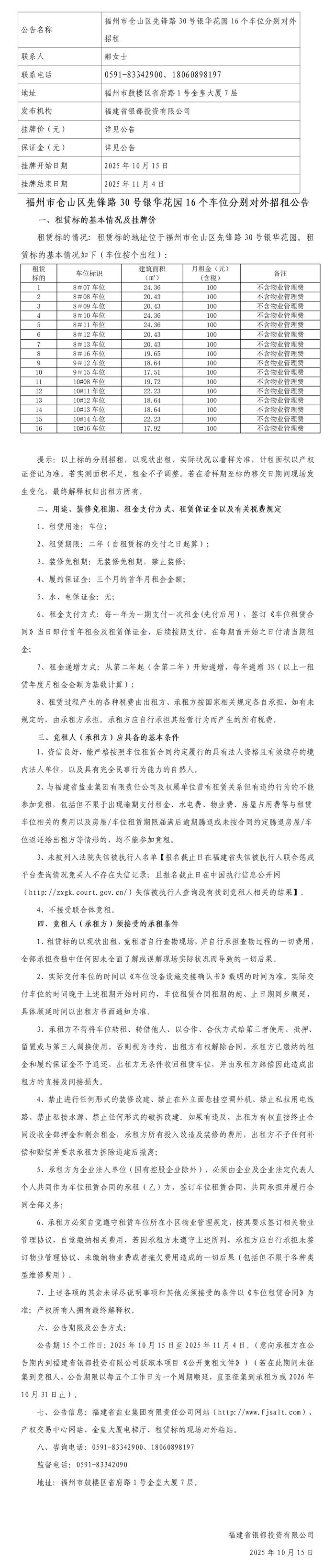 福州市银华花园16个车位分别对外招租公告