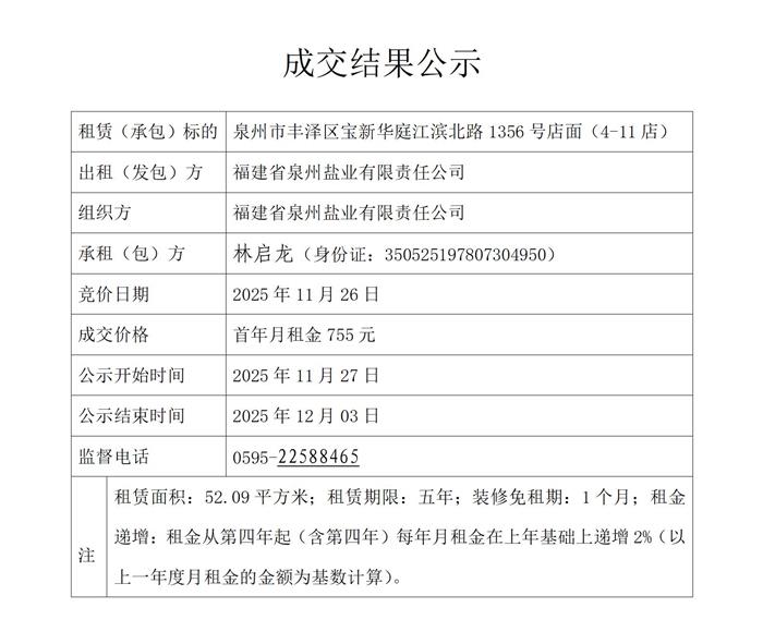 泉州市丰泽区宝新华庭江滨北路1356号店面(4-11店)招租成交结果公示
