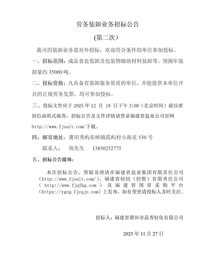 福建省莆田市晶秀轻化有限公司劳务装卸业务招标公告(第二次)20251127