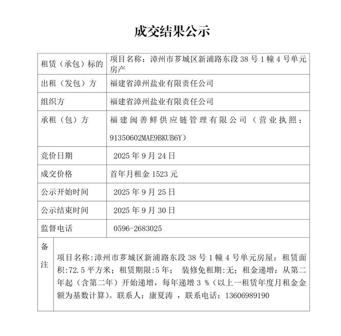 漳州市芗城区新浦路东段38号1幢4号单元房产招租成交结果公示