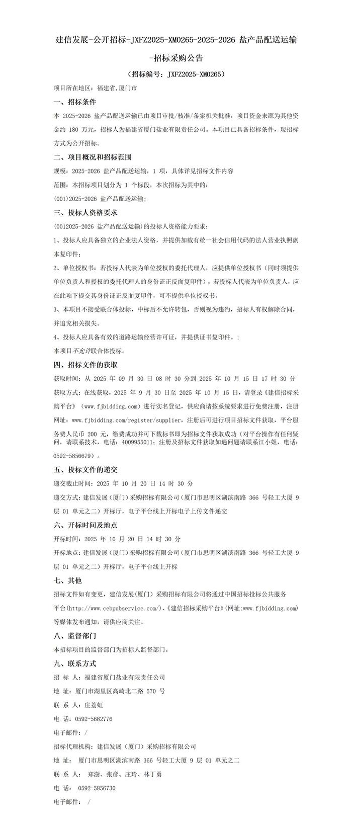 福建省厦门盐业有限责任公司2025-2026盐产品配送运输招标采购公告