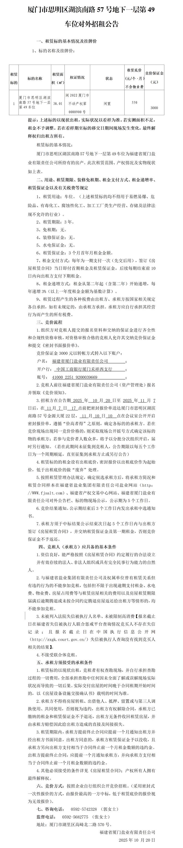 厦门市思明区湖滨南路57号地下一层第49车位对外招租公告