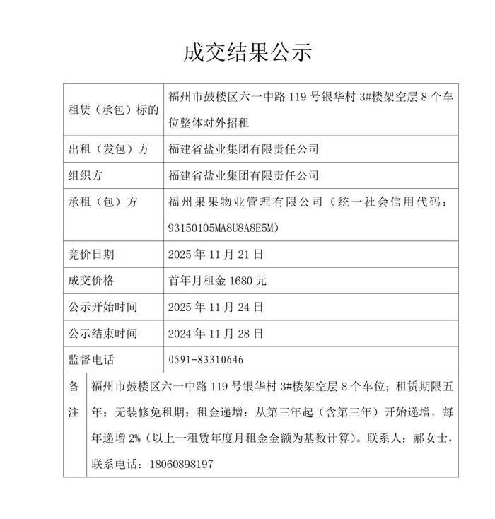 福州市鼓楼区六一中路119号银华村3#楼架空层8个车位整体对外招租成交结果公示